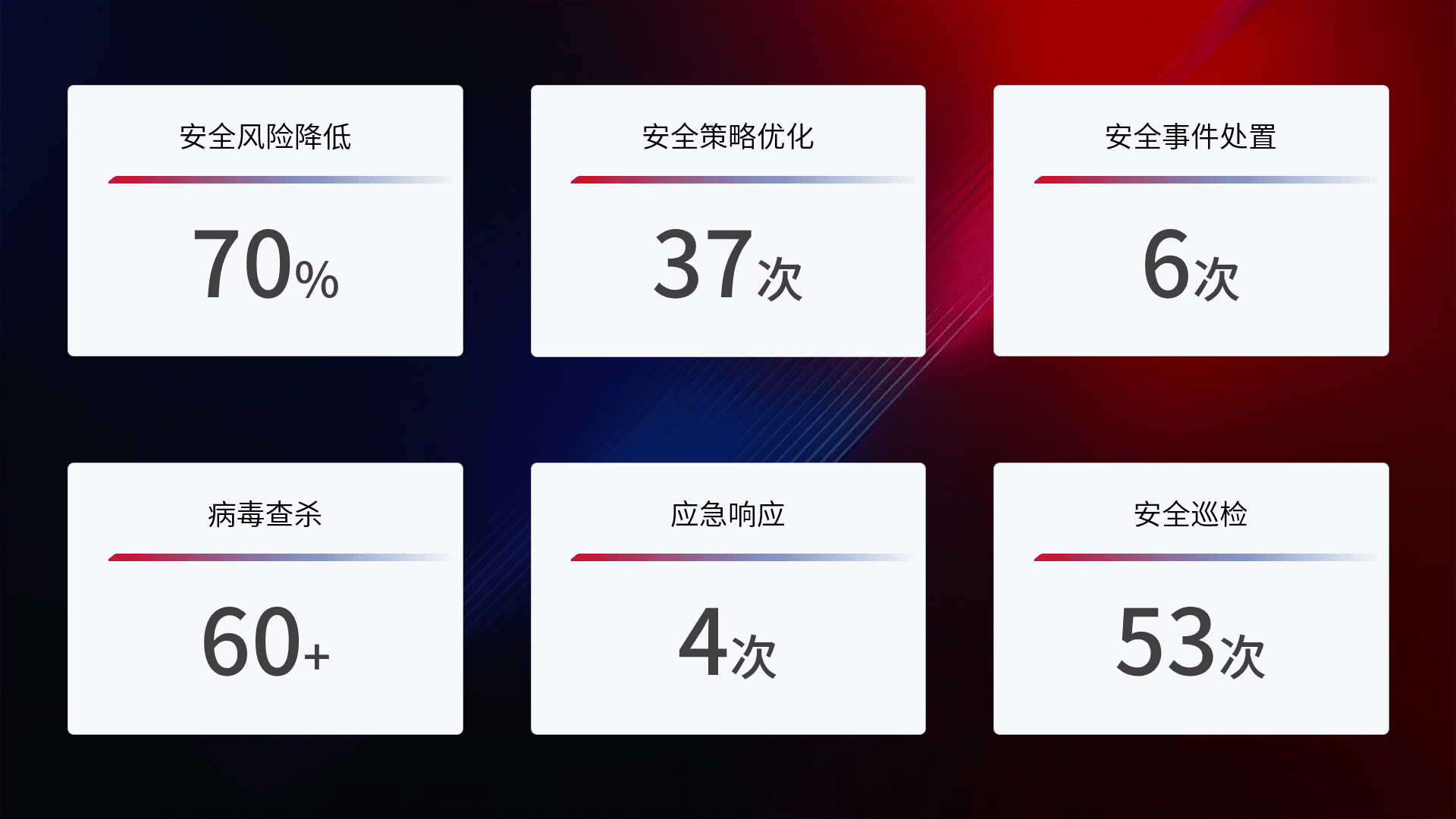 提供全面的安全事件报告体系,,,包括处置报告、、、、周报、、、、季度和年度总结,,,结合持续监控,,,帮助客户深入了解网络安全状况。。。
