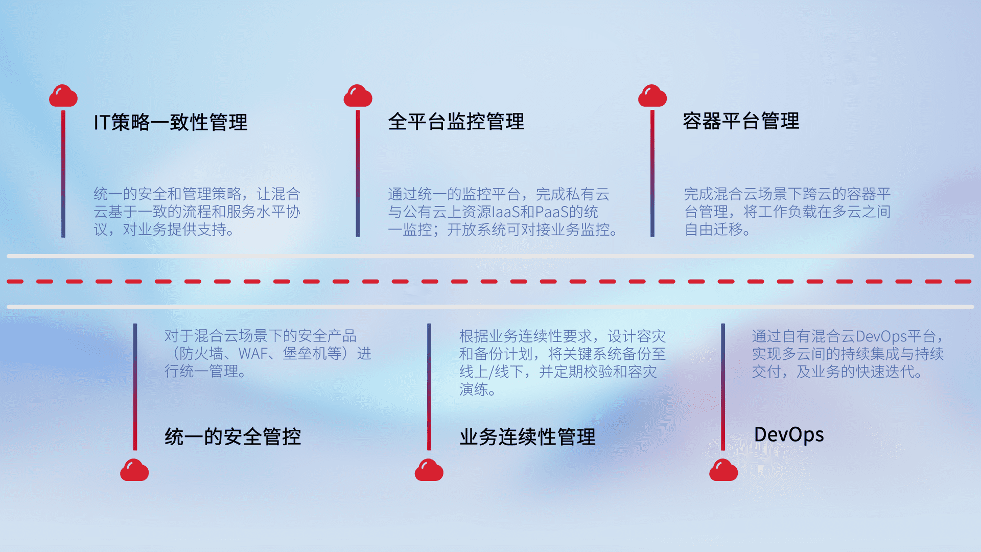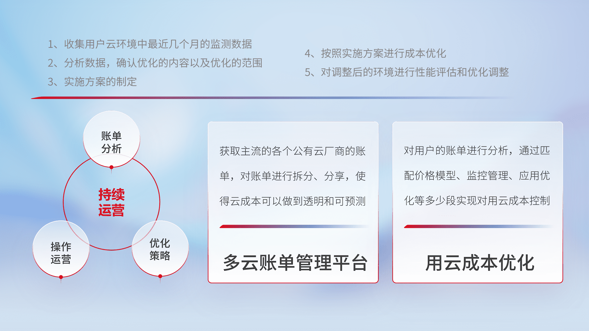 通过多云纳管,,,以统一的资源数据模型把客户的云资源进行抽象和封装,,,进而实现对多云资源的统一操作,,,保障云资源管理的可靠性、、稳定性与可用性。。量身定制化运维内容,,,配置、、、、开发运维、、、补丁管理、、备份、、、、监控、、、认证和访问管理、、审计和日常巡检等,,保障在用云过程中的可靠度,,稳定度以及高可用率。。。