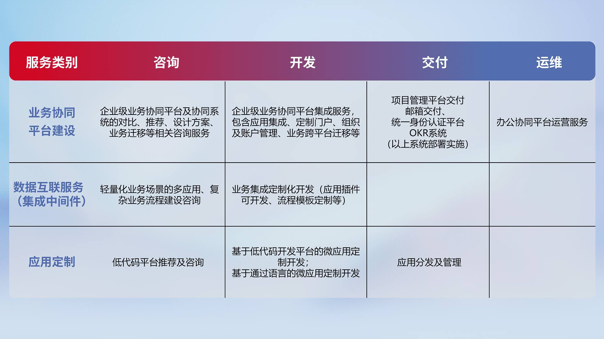 针对钉钉、、、企微、、IDaas等平台级产品提供产品的规划、、方案、、交付、、、定制化开发等服务,,,实现如统一协同办公、、智能客户服务、、、混合会议管理、、、智能数据查询、、等业务场景,,实现数字化转型。。。